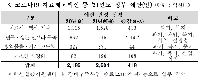 정부는 코로나19 치료제·백신 관련 내년도 예산을 올해 2186억원 대비 418억원을 늘린 2604억원을 편성, 국회 제출한 상태로 지원 강화를 약속했다.