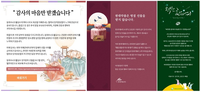 동아쏘시오홀딩스는 홈페이지 팝업창을 통해 '감사의 마음만 받겠다'고 공지했다. 동아쏘시오홀딩스는 "건강한 사회분위기를 만들고자 외부 이해관계자로부터 일체의 선물수취를 금지하고 있으니, 적극적인 동참을 부탁드린다"며 "임직원이 선물을 요구할 경우 제보해달라"고 했다. 동아는 지난 설에도 통해 선물 수취금지를 공지한 바 있다.