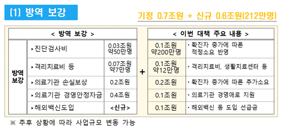 코로나19 확진자 증가에 대비해 진단검사비 지원을 위해 1000억원이 추가 확충되며 코로나19 확진자의 격리치료를 위한 임시 생활시설, 치료센터, 진료소 및 치료비 등을 위해 1000억원이 투입된다.