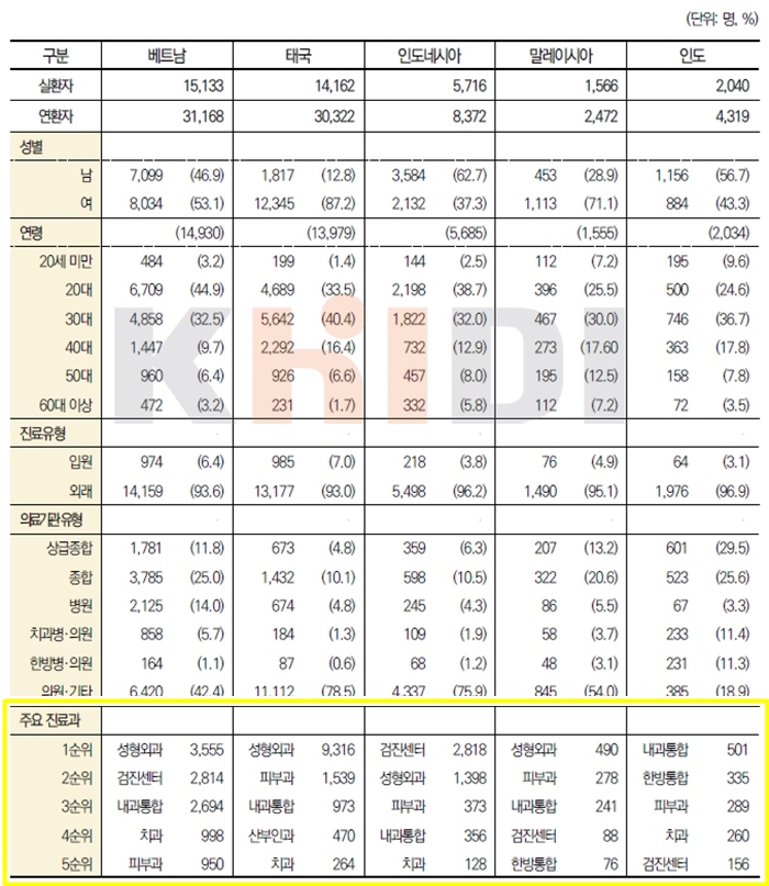 신남방 정책에 따라 의료관광객은 베트남, 태국, 인도네시아, 필리핀, 싱가포르, 말레이시아, 인도를 중심으로 움직였다. 이들의 70%가 한류 소비층인 20~30대였다. 성형외과 1만6824명(34.4%), 검진센터 6692명(13.7%), 내과 5821명(11.9%), 피부과 4802명(9.8%) 등 강남 일대 미용성형 목적이 많았다. 베트남은 연환자 3만1168명으로 전년 대비 100.9%나 늘기도 했다.
