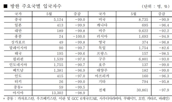 한국관광공사에 따르면 지난 5월 우리나라를 찾은 해외 여행객은 전년 대비 97.9% 감소한 3만861명으로 집계됐다. 중국과는 항공사별 1개 노선을 제외한 전 노선 운항을 중단해 관광객 99%가 줄었고 일본과의 입·출국 제한조치도 계속돼 99.9%가 감소했다. 아시아·중동 관광객(98.2%)과 단체 해외여행객을 금지한 대만도 99.8%나 줄었다.