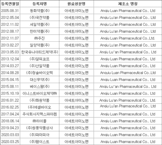 식약처의 원료의약품 등록(DMF) 현황을 보면 총 100건의 아세트아미노펜 원료의약품이 등록된 상태다. 이중 20건이 안치우 루안으로부터 들여온 원료로 나타났다.