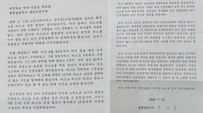 약국에 편지 보낸 도지사…"약사의 137일 희생 기억"