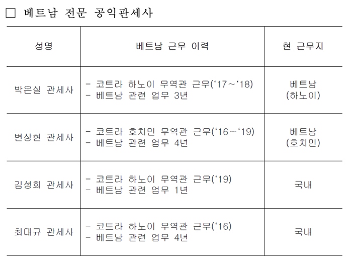 관세청은 베트남 관세·통관 문제가 2017년 19건에서 2019년 45건으로 늘었다고 밝혔다. 그러나 베트남 현지 관세관은 호치민(1명)에만 있어 국내 수출 기업을 지원하기에 역부족이었다.