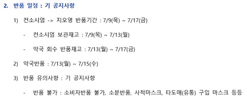소분 제품, 사적마스크, 타도매 구입 마스크, 소비자 반품 불가 제품 등은 반품이 불가하다.