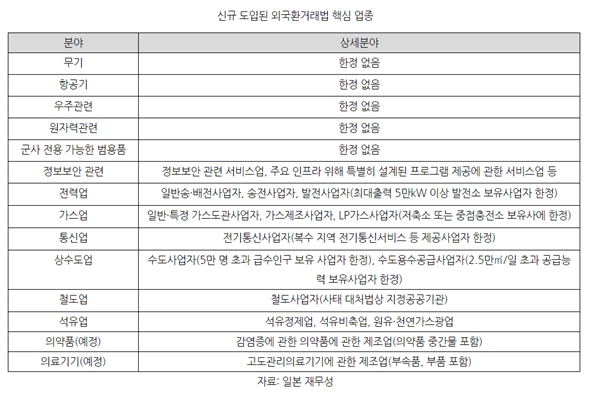 한편 이달 6일 일본 정부는 외국환 및 외국무역법(이하 외환법)을 통해 국가 안보상 중요하다고 판단한 주요 산업 155개 업종을 지정하고 해외자본 진입 규제를 강화했다.