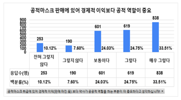 ‘공적마스크를 판매하면서 사회에 기여하고 있다는 개인적 보람을 느꼈냐’는 질문에 ‘매우 그렇다’ 737명(29.47%), ‘그렇다’ 701명(28.03%), ‘보통이다’ 537명(21.47%)으로 응답자의 78% 이상이 긍정적으로 평가했다.