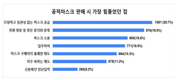 공적마스크 업무에 있어 가장 힘들었던 점으로는 ▲매번 바뀌는 마스크 제조사/포장단위/KF종류 입고 20.7%(1,061명) ▲잦은 전화·방문 문의 및 응대 19.0%(976명) ▲마스크 소분 15.6%(800명) ▲조제·의약품 판매 업무마비 15.0%(771명) ▲마스크 구매자의 불쾌한 태도 13.3%(684명) ▲자주 바뀌는 판매제도 11.2%(575명) ▲신분 확인 및 전산입력 265명(5.2%) 순으로 답했다.