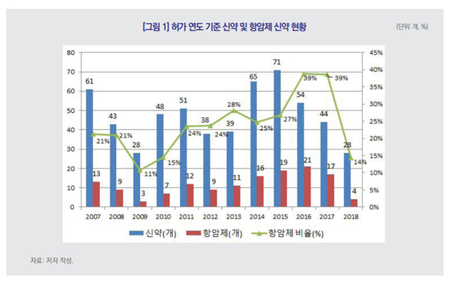 식품의약품안전처 허가 데이터베이스를 분석한 결과, 지난 12년 동안 연평균 47.5품목의 신약이 허가됐다.