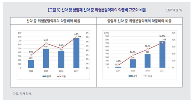 2014년 신약 중 RSA 약품비는 209억원으로 전체 신약 약품비의 2.9%를 차지한 반면, 2017년에는 그 값이 각각 768억 원, 7.1%로 상승했다. 항암제 신약에서 위험분담약제의 약품비는 2014년 27억원으로 전체 항암제 신약 약품비의 3.3%에서, 2017년에는 각각 756억 원, 36.1%로 급격히 늘었다.
