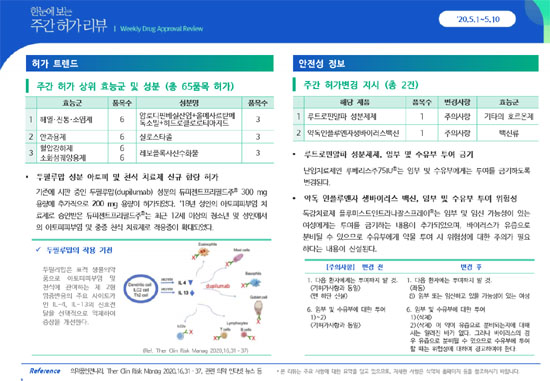 약정원은 기존 월 주기로 제공되던 의약품 허가, 안전성 정보를 더 발 빠르게 전달하기 위해 허가 트렌드와 안전성 정보를 한눈에 볼 수 있도록 매주 업데이트해 주간 허가 리뷰에 담았다고 설명했다.