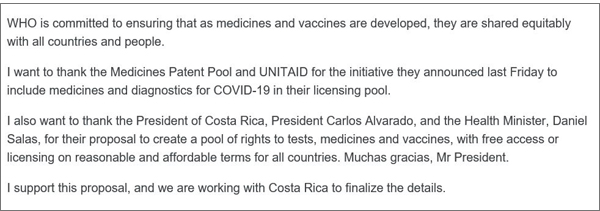 나흘 뒤 WHO는 언론브리핑에서 "치료제와 백신이 개발돼 모든 국가와 사람들이 공평하게 공유할 수 있게 노력하겠다"며 먼저 의견을 제안한 코스타리카에 감사의 뜻을 표했다. 사실상 의견을 수용한 셈이다.
