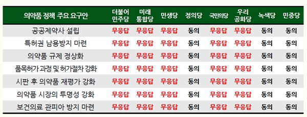 앞서 건약은 더불어민주당, 미래통합당, 민생당, 정의당, 국민의당, 우리공화당, 녹색당, 민중당 등 8개 정당에 4·15 총선 관련 주요 의약품 정책안을 제시하고 답변을 요구했다.
