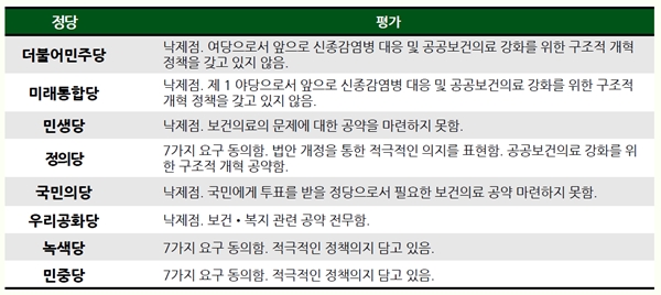 건약은 더불어민주당과 미래통합당에 "여당과 제 1야당으로서 신종감염병 대응, 공공보건의료 강화를 위한 구조적 개혁 정책을 갖고 있지 않다"며 낙제점 평가를 했다.