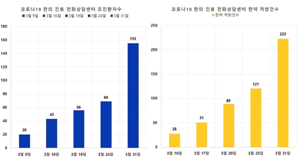 한의협은 지난 3월 말 이후 전체 코로나19 확진자 수 증가세는 다소 둔화하고 있지만 대구 전화상담센터의 초진환자 수는 3월 9일 20명에서 3월 31일 155명(서울 전화상담센터 포함) 으로 꾸준히 늘었다고 밝혔다. 한약 처방건수도 3월 10일 28건에서 31일에는 223건으로 증가했다고 했다.