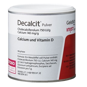 데칼시트산은 1통이 100g이다. 제품 안에 든 계량스푼으로 용량조절이 용이하다. 계량스푼 한 스푼(1g)은 비타민D3 750IU와 인산수소칼슘수화물 600mg 성분으로 구성된다.