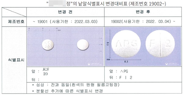 해당 제품은 국내 B제약사가 제조한 파모티딘 성분 위장약이다. 동일한 제형 크기와 색상이었지만 식별 표시가 'KS20(앞면)'에서 'APG(앞면), F2(뒷면)'으로 변경돼 있었다. 식별 표시 등록일을 약학정보원에서 찾은 결과 2007년 1월에 변경 이력이 있었고 지난 6월 새로 변경한 사실이 확인됐다.