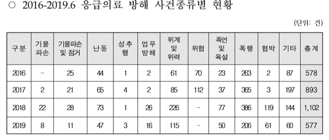 최근 3년간 응급의료 방해 사건을 보면, 2017년 893건, 2018년 1102건, 올해 6월까지 577건이 발생했다.