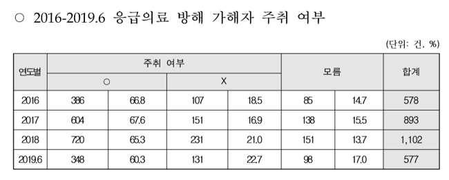 또한 매년 응급실에서 의료방해 행위가 발생함에도 불구하고, 적극적인 수사 및 법적 조치는 이뤄지지 않고 있었다.