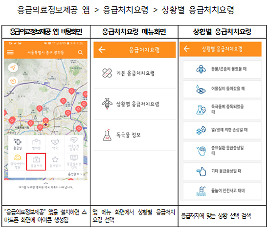앱은 사용자 위치 기반으로 주변에 문을 연 병의원과 약국을 지도로 보여주고 진료시간과 진료과목도 조회할 수 있다. 또한 야간진료기관 정보, 자동심장충격기(AED) 위치 정보, 응급처치요령 등 유용한 내용이 담겨 있다.