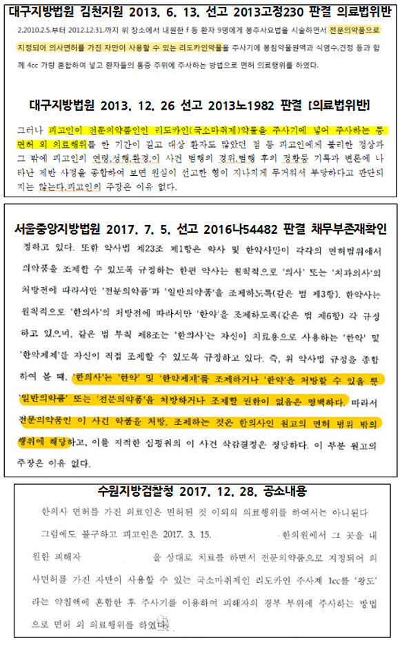 그간 리도카인 등 한의사 전문약 사용과 관련한 법원의 판단은 "전문약으로 지정돼 의사면허를 가진 자만이 리도카인을 사용할 수 있다"는 대구지법의 한의사 의료법위반 판례와 "한의사는 한약 및 한약제제를 조제하거나 한약을 처방할 수 있을 뿐 일반약 또는 전문약을 처방·조제할 권한이 없음은 명백하다"고 판시한 서울지법 판례 등을 꼽을 수 있다.