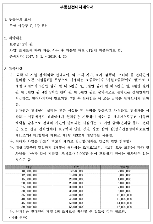사건을 보면 A약사는 2017년 4월 경 부산 사상구 한 건물 1층 약국자리를 B약사에게 전대차 하기로 하고 보증금 2억원에 B약사의 내과의원 유치를 위한 컨설팅비용 명목으로 5000만원 등 총 2억 5000만원을 지급했다.