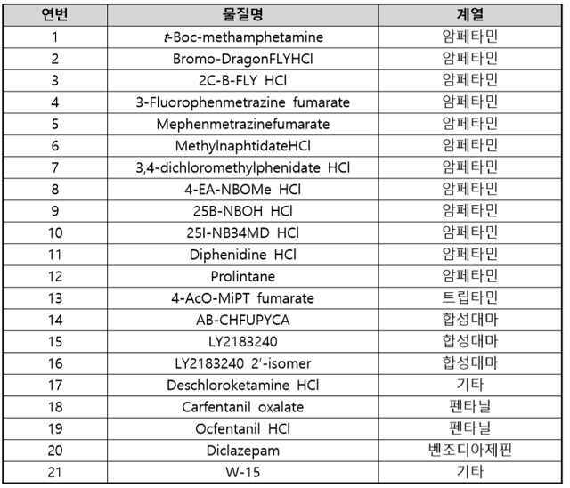 식약처가 확립한 표준물질 21종은 ▲암페타민류 12종 ▲합성대마 3종 ▲펜타닐류 2종 ▲트립타민류 1종 ▲벤조디아제핀 1종 ▲기타 2종이다.