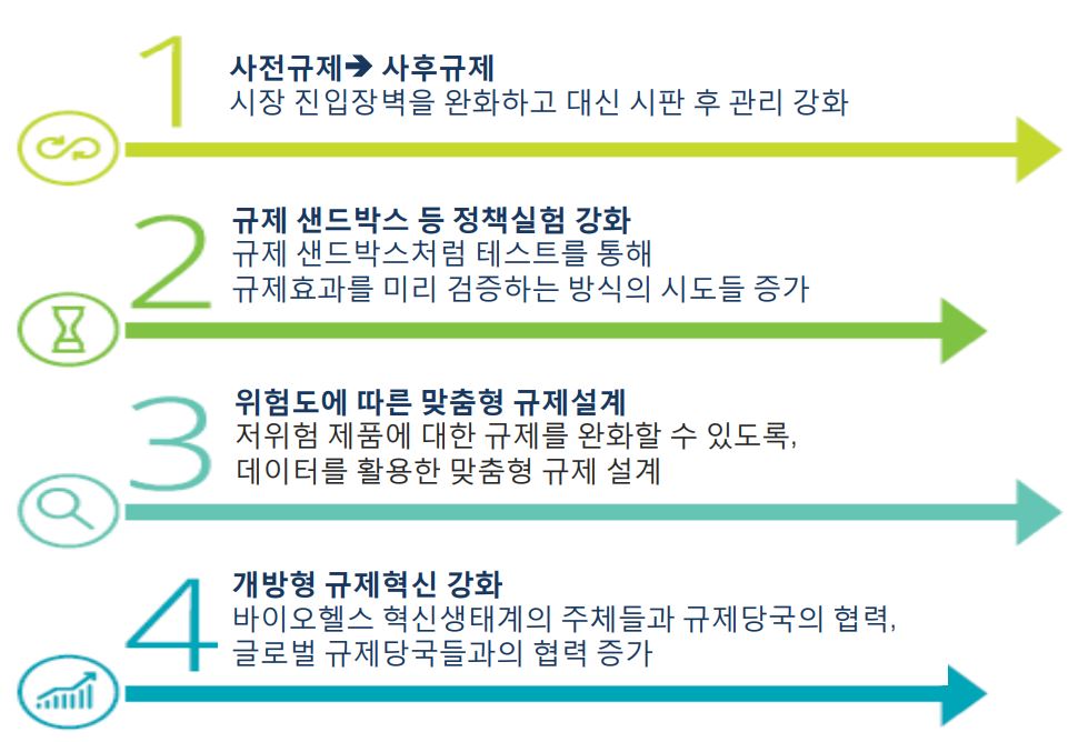 그에 따르면 최근 글로벌 규제 혁신은 크게 네 가지 특성이 있다. 첫째, 사전규제가 사후규제로 바뀌어가는 모습이다. 시장 진입장벽을 완화하는 대신 시판 후 관리를 강화하는 내용이다.
