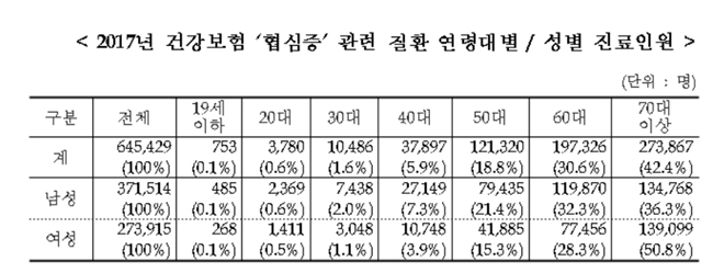 협심증 진료에 지출한 총진료비는 2012년 5660억원에서 2017년 7701억원으로 약 1.4배 증가했다.
