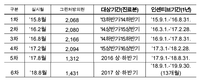 내년도 제7차 그린처방의원 지정 부터는 PCI 대상범위를 현행 심사결정 2개월에서 3개월로 확대됨에 따라 그린처방 지정 실시월이 2019년 9월로 변경되면서 인센티브 기간은 같은해 10월부터 1년간 적용된다.
