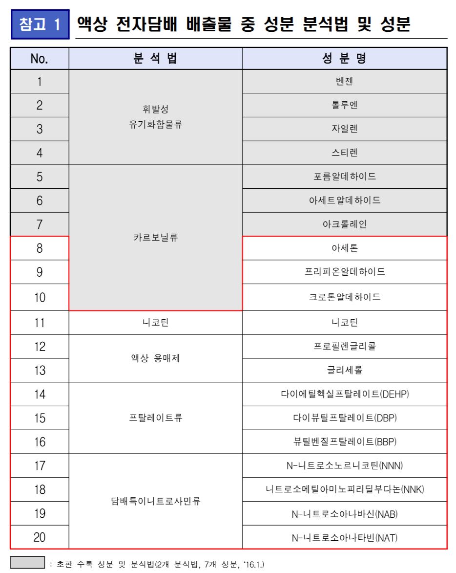 추가 성분은 ▲아세톤 등 카르보닐류 3개 성분 ▲니코틴 ▲프로필렌글리콜 등 액상용매제 2개 성분 ▲다이에틸헥실프탈레이트(DEHP) 등 프탈레이트류 3개 성분 ▲N-니트로소노르니코틴 등 담배특이니트로사민류 4개 성분 등이다.