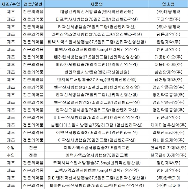 또한 벤라팍신염산염 성분 일반 정제를 복용하고 있는 우울증 환자는 서방형캡슐로 변경 가능하며, 이 경우 정제 투여량에 가장 근접해야 한다고 덧붙였다.