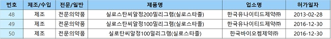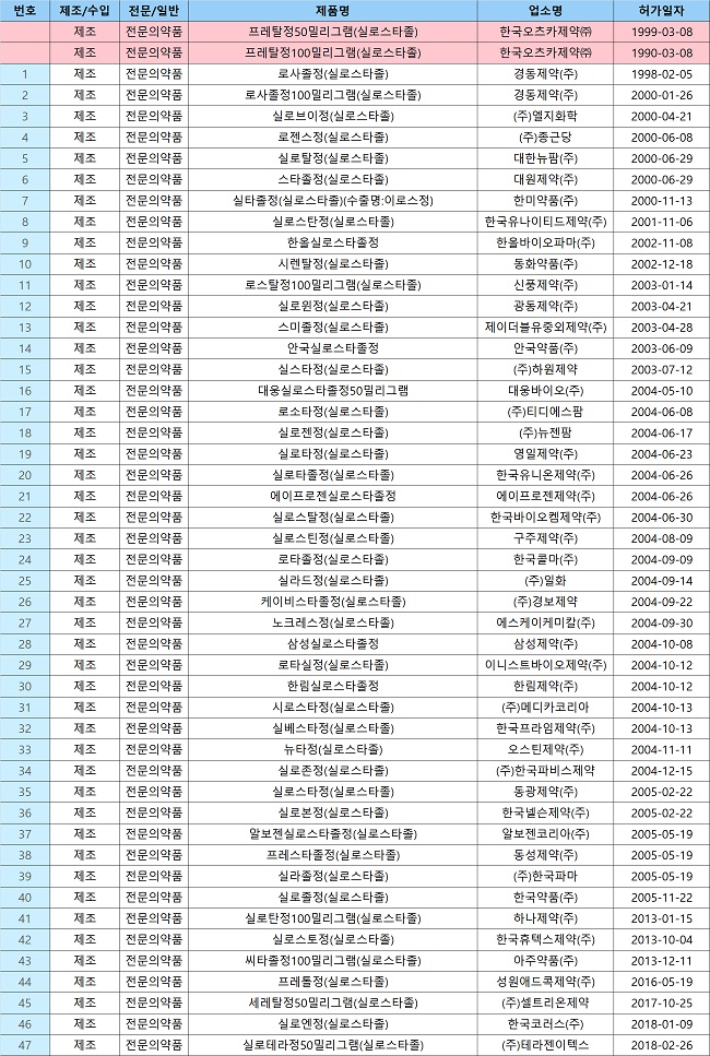 식품의약품안전처(처장 류영진)는 16일 실로스타졸 단일제(정제)와 실로스타졸 은행엽엑스 복합제(정제)에 대한 안전성& 8729;유효성 심사를 근거로 허가사항 변경지시를 밝혔다.