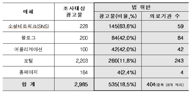 인터넷 매체별 의료법 위반 개수를 보면 2895개의 광고물 중 의료법 위반 광고물 수는 535건(18.5%), SNS 59건(63.6%), 블로그 84건(42%), 모바일애플리케이션 42건(42%), 포털 260건(11.8%) 등 순이었다.