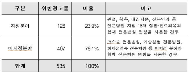 이어 전문병원 지정분야 위반 의료광고가 128건(23.9%)으로 나머지를 차지했다. 복지부가 지정하지 않은 비지정 분야인데도 성형외과를 비롯해 치과, 피부과, 내과 순으로 'OO전문병원' 명칭을 사용했다.