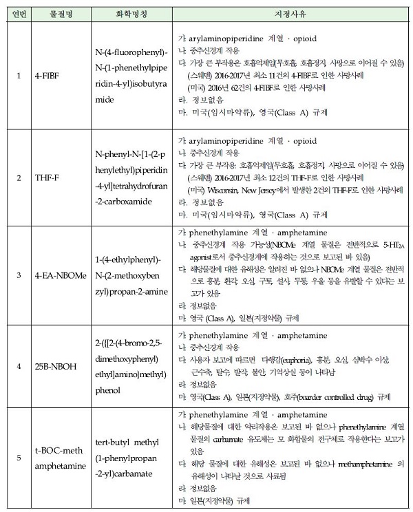 지정 물질 중 4-FIBF와 THF-F는 WHO 지정 마약류 권고 물질이며, 펜타닐(마약)과 유사한 구조로 호흡 억제 등 부작용을 비롯해 다수의 사망사례가 미국과 스웨덴에서 보고된 바 있다.