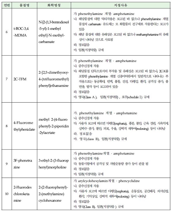 식약처는 세부적으로 가·나·다·라·마군으로 지정 사유를 분류했다. 가군은 구조적·효과적, 나군은 약리효과(중추신경계 자극, 흥분, 억제 등), 다군은 부작용·유해사례, 라군은 국내 반입·유통 여부, 마. 국외 유통·규제현황이다.