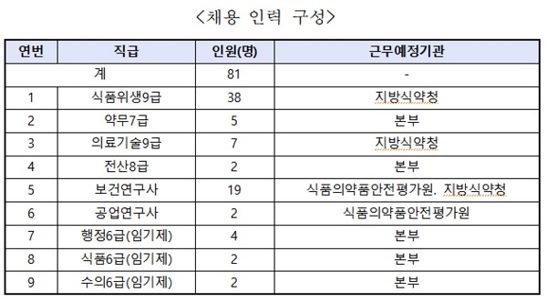 4일 식약처는 국민 건강과 직결되는 식품과 의약품 안전관리 업무를 수행할 6급 이하 경력직 공무원 81명을 경력경쟁채용을 통해 선발한다고 공고했다.