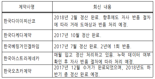 최초 발표한 10개 비협조사 중 반품 협조사실 및 추후 협조계획이 확인돼 명단에서 제외된 5개 제약사는 ▲한국다이이찌산쿄 ▲한국다케다제약 ▲한국오츠카제약 ▲한국베링거인겔하임 ▲한국아스트라제네카 등이다.