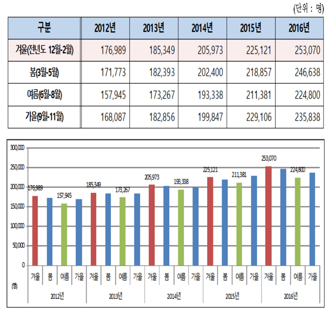 실제 2016년 기준으로 겨울철(전년도 12월부터 2월) 진료인원은 25만3070명으로 여름철(6월부터 8월) 진료인원 22만4800명 보다 12.6%(2만8270명) 더 많았다.
