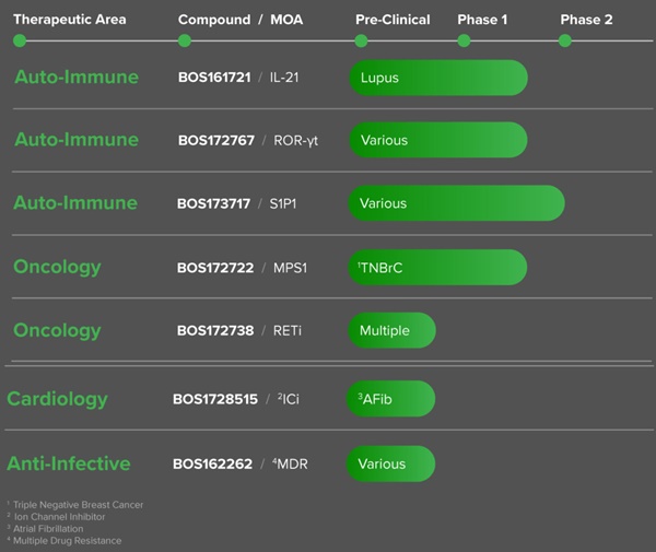 국내에서 다소 생소할 수 있는 보스톤 파마는 2016년 미국 매사추세츠주 캠브리지에 설립된 회사다. 가능성 있는 신약후보물질을 찾아 최상의 의약품으로 개발한다는 데 목표를 두고 있다. 개념증명(proof of concept) 단계까지 개발과정을 가속화 하거나 3상임상에 빠르게 진입하도록 돕는 일이 보스톤파마가 가장 자신하는 분야다. 법인 설립 2년 여 만에 자가면역질환과 심혈관질환, 감염질환, 암 등 4가지 질환군에서 7개 파이프라인을 획득했고, 그 중 4개가 임상단계에 진입할 만큼 추진력도 갖췄다.