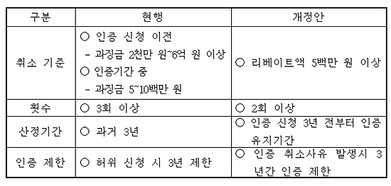 리베이트 기준도 손질했는데, 현행 과징금으로 산정했던 인증취소 기준을 리베이트 500만원 이상 금액으로 변경할 예정이다.
