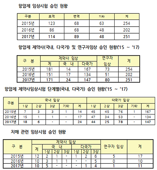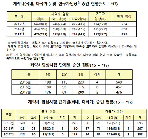 최근 3년 간 제약사 임상시험 승인건수은 2015년 540건, 2016년 457건, 2017년 476건이었으며 이 중 다국가 임상은 지난해 293건이 승인돼 2016년 267건보다 9.7% 늘었다.