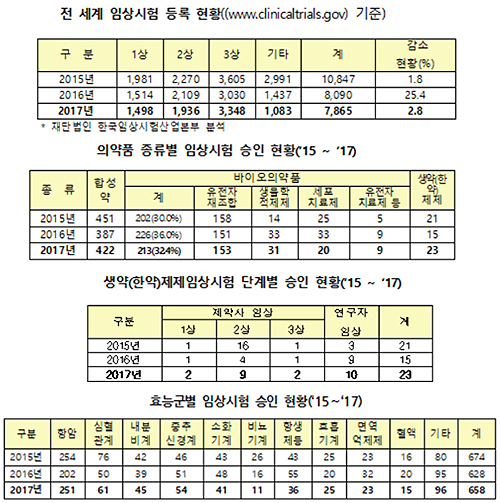 실제로 미국 임상등록 사이트(www.clinicaltrials.gov) 임상시험 현황 기준 현황에 따르면 전세계 임상시험은 2015년 1만847건에서 2016년 8090건, 지난해에는 7865건으로 감소세를 보이고 있다.