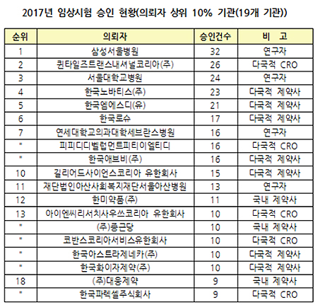 연구개발 수탁전문기업(CRO)은 퀸타일즈트랜스내셔널코리아 26건으로 단연 많았고, 피피디디벨럽먼트피티이엘티디 16건 순이었다.