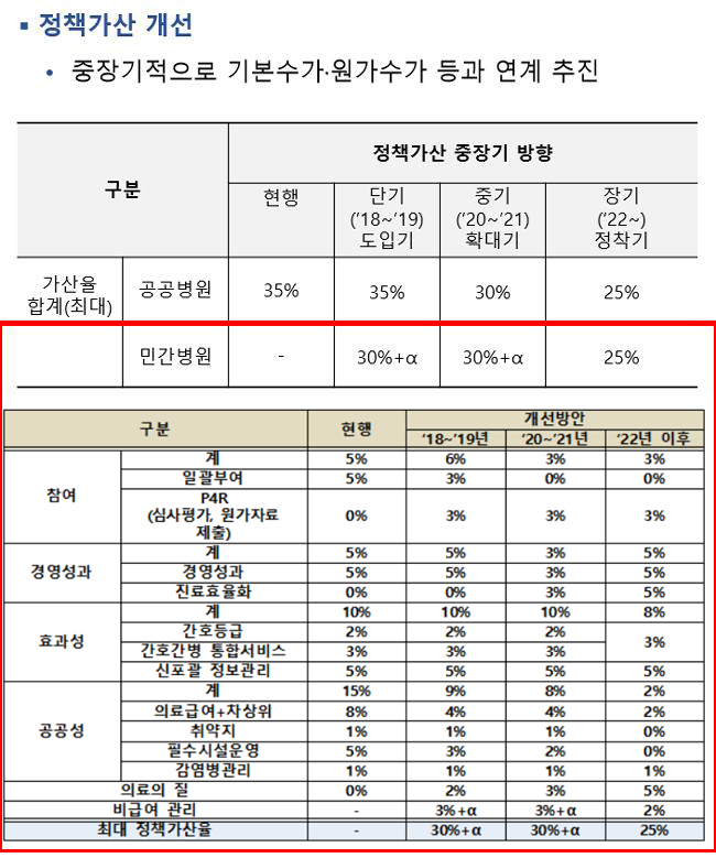 정책가산 중장기 방향에서 단기에서 중기로 갈 수록 가산율이 공공병원의 경우 35%에서 25%로, 민간병원이 30%+@에서 25%로 줄어든 부분에 대해선, "단기적으로 가산지표에 해당하던게 중장기적으로 기본수가에 포함될 것으로 보고 있다"며 "현행 가산을 기본수가화 하면서 정책을 만들어 가기 위한 목표"라고 했다.