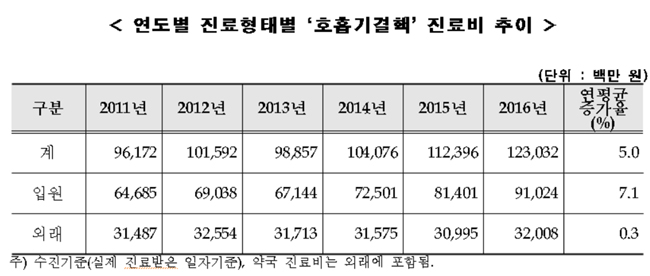 최근 5년 간 호흡기결핵으로 진료 받은 환자수는 연평균 4.5% 감소했지만, 진료비는 반대로 연평균 5% 증가한 것으로 나타났다.