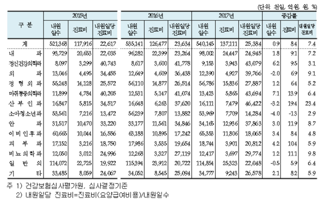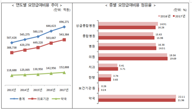 이 같은 사실은 건강보험심사평가원(원장 김승택)과 국민건강보험공단(이사장 김용익)이 21일 2017년 진료비를 분석해 내놓은 '진료비 통계지표'와 '건강보험 주요통계'를 통해 확인됐다.