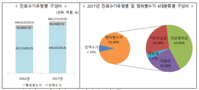 건강보험 진료수가 유형별을 보면 행위별수가 진료비가 92.8%인 64조6111억원으로 진료행위료가 28조4693억원(44.06%), 기본진료로 17조2366억원(26.68%), 약품비 16조2098억원(25.09%), 재료대 2조6955억원(4.17%)의 점유율을 차지했다. 정액수가 진료비는 5조160억원 수준이다.