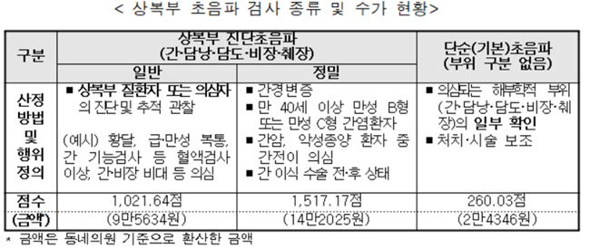 일반초음파는 의사의 판단 하에 상복부 질환자 또는 의심 증상이 발생하여 검사가 필요한 경우 보험이 적용되고, 간암 또는 악성종양 환자 중 간 전이 의심, 간 이식 수술 전·후 상태 평가(이하 기존 급여대상자), 간경변증, 만 40세 이상 만성 B형 또는 만성 C형 간염환자 등을 대상으로 하는 정밀초음파는 만성간염, 간경변증 등 중증질환자에 대해 보험이 적용된다.